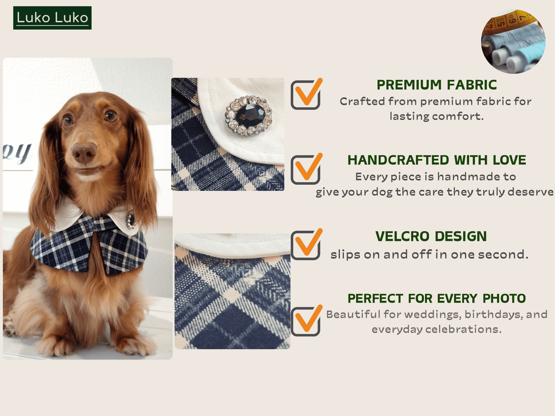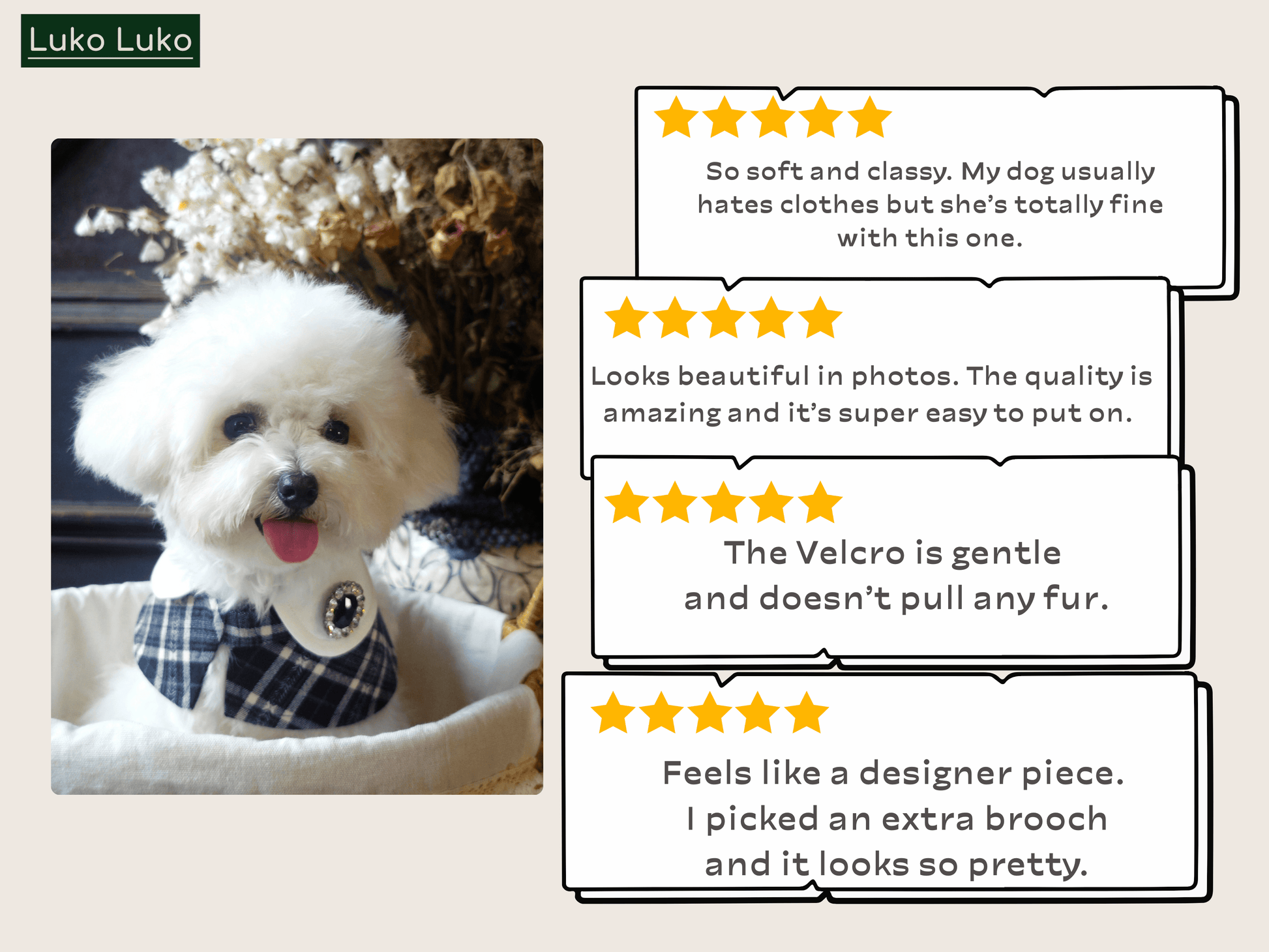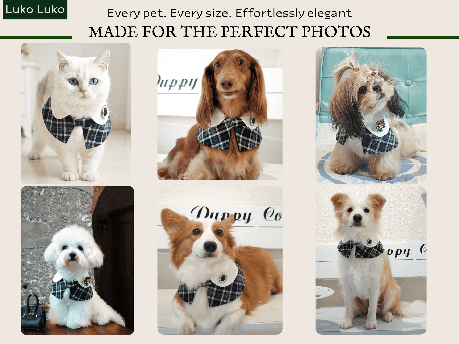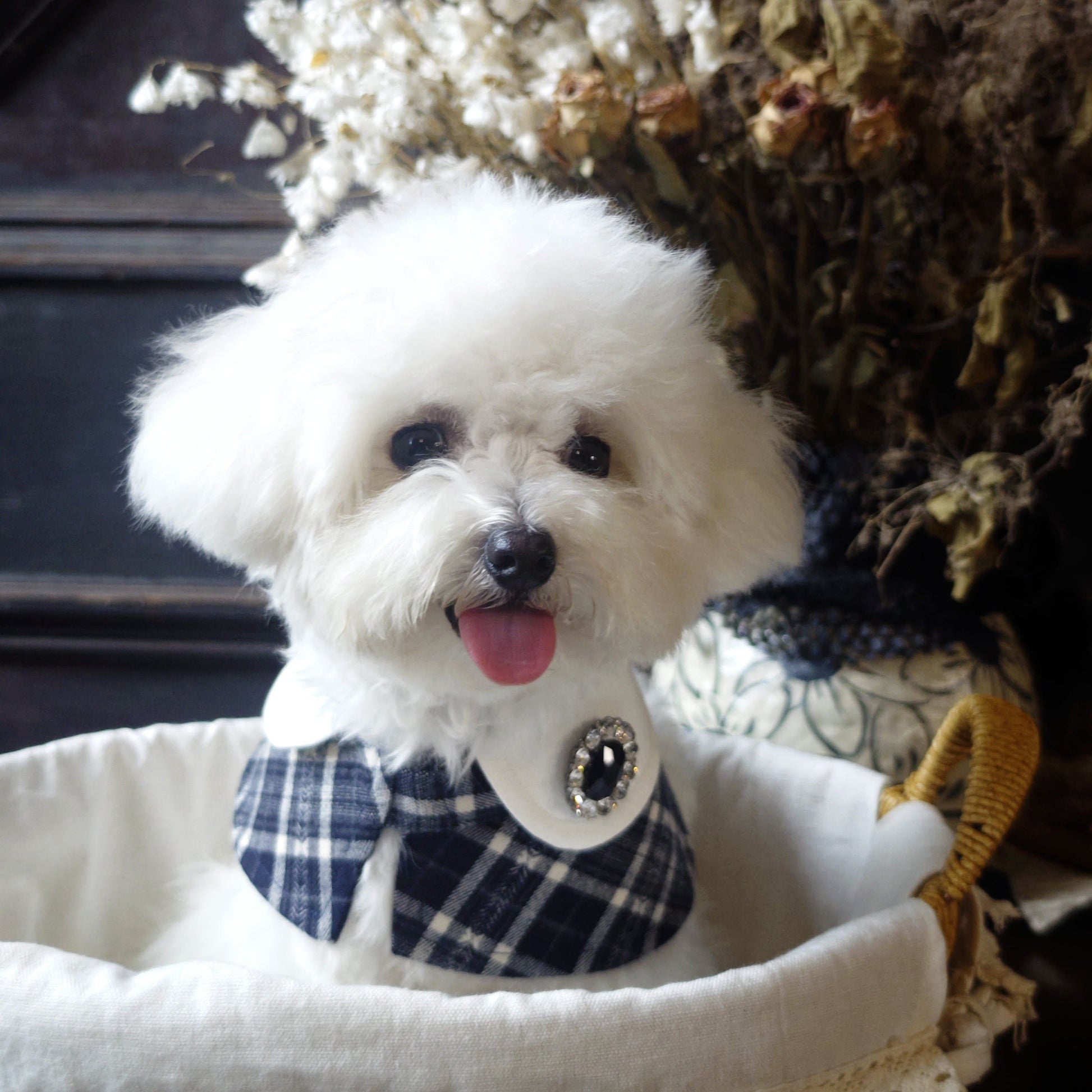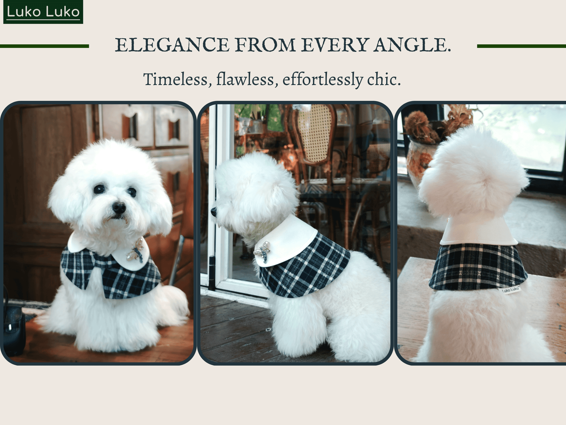 Embrace timeless elegance with the Sophie Cape Bandana, where French refinement meets effortless charm. Featuring a crisp white collar, deep navy plaid, and a detachable design that pairs beautifully with our selection of decorative brooches (sold separately), this piece captures the grace of Parisian style.