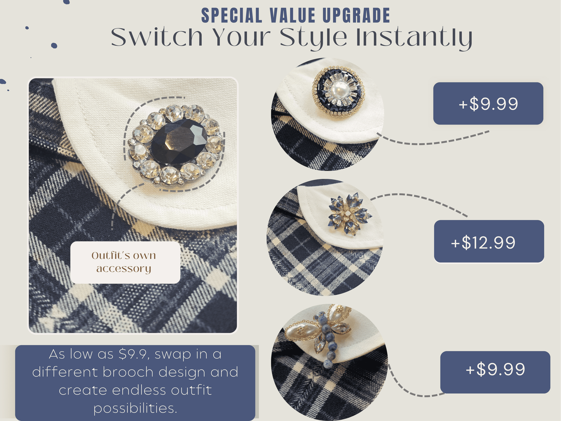 Detachable design with optional brooch styles available separately