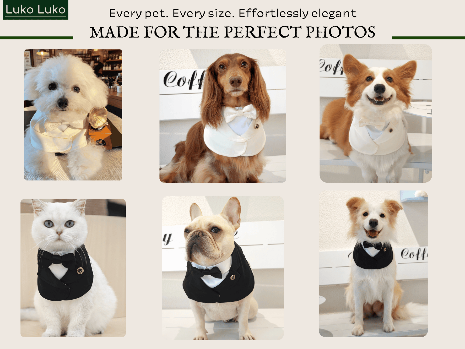 This classic beige/black suit brings sophistication to any occasion. Made from premium fabric, it features a comfortable fit with an adjustable Velcro closure for easy wear. Perfect for formal events, photoshoots, and special celebrations. A refined look for stylish pets!
