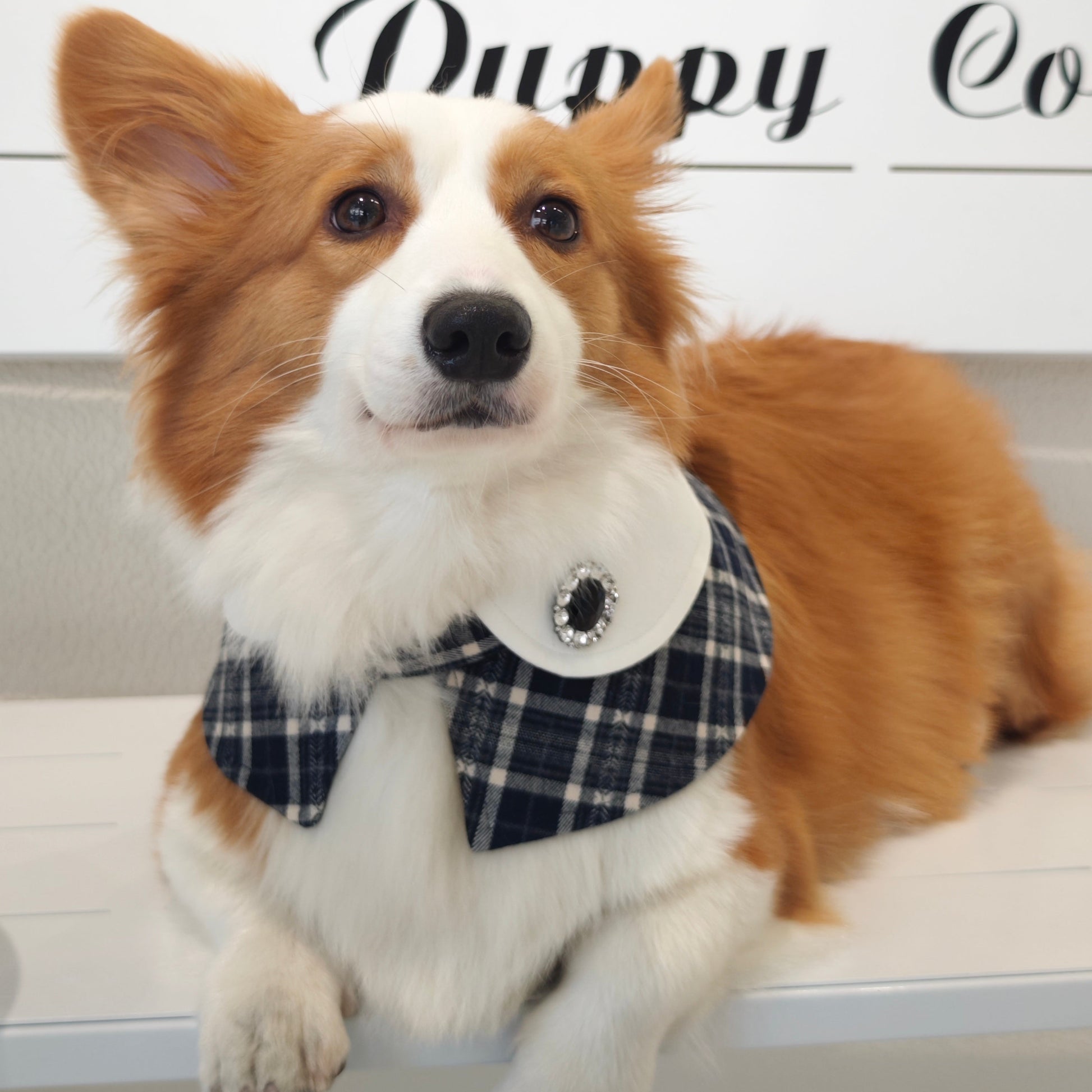 Embrace timeless elegance with the Sophie Cape Bandana, where French refinement meets effortless charm. Featuring a crisp white collar, deep navy plaid, and a detachable design that pairs beautifully with our selection of decorative brooches (sold separately), this piece captures the grace of Parisian style.